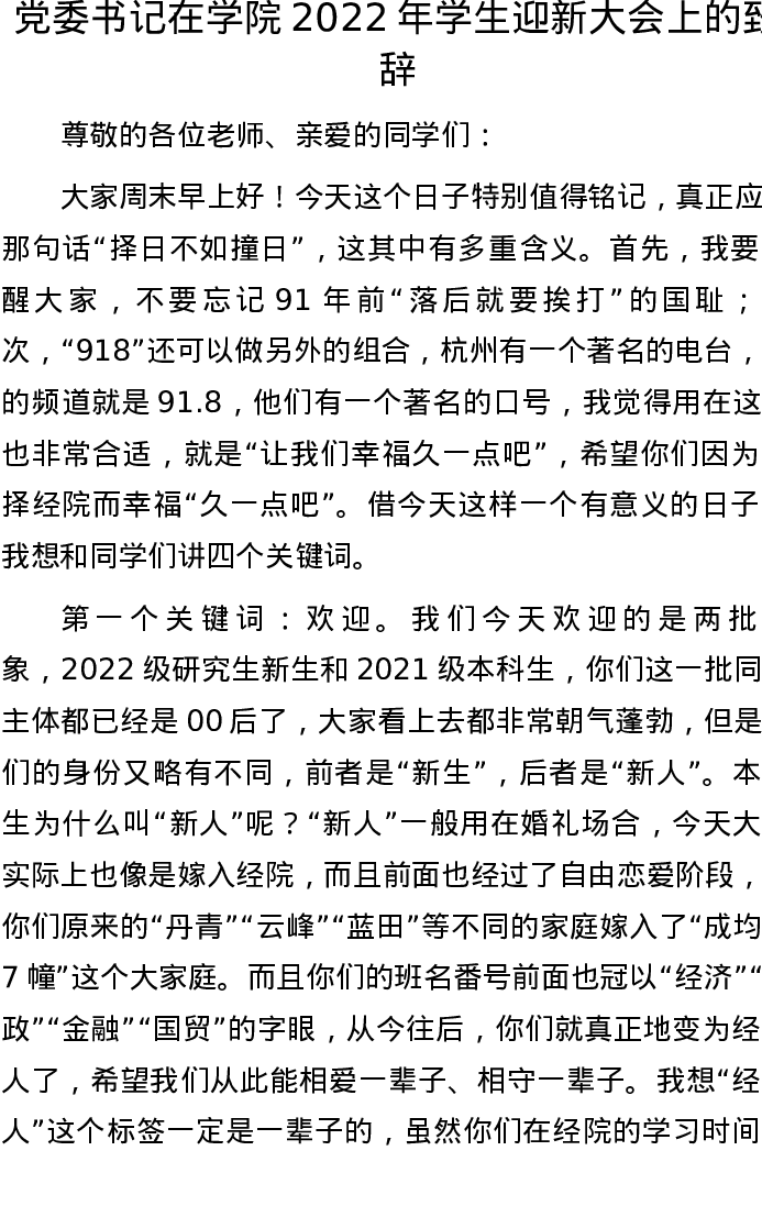 20221004党委书记在学院2022年学生迎新大会上的致辞