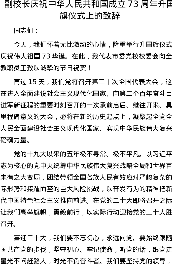 20221007副校长庆祝中华人民共和国成立73周年升国旗仪式上的致辞