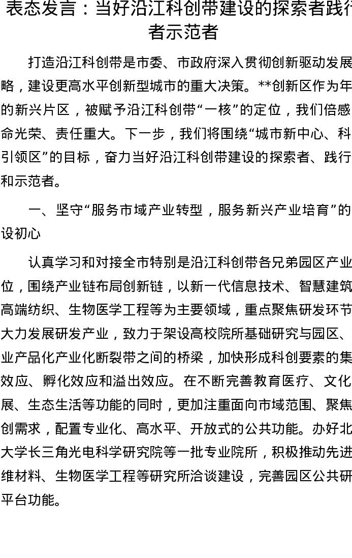 20221007表态发言:当好沿江科创带建设的探索者践行者示范者