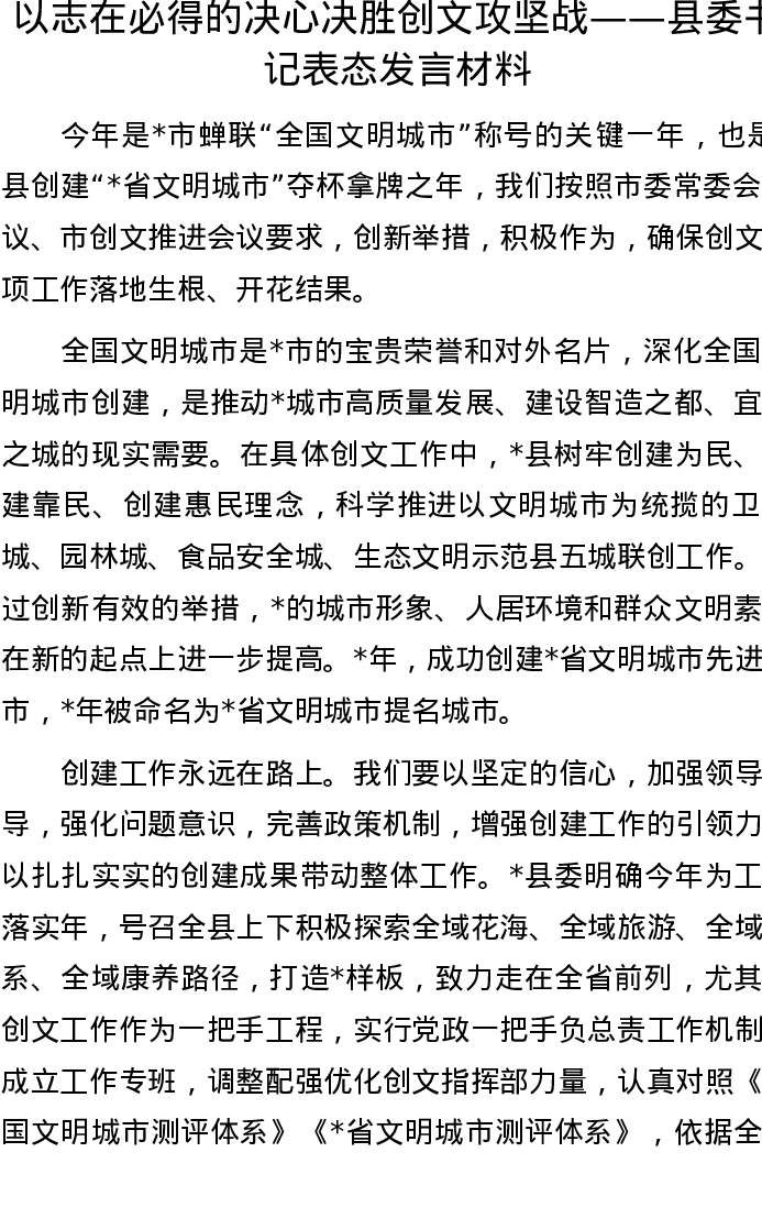 20221008以志在必得的决心决胜创文攻坚战——县委书记表态发言材料