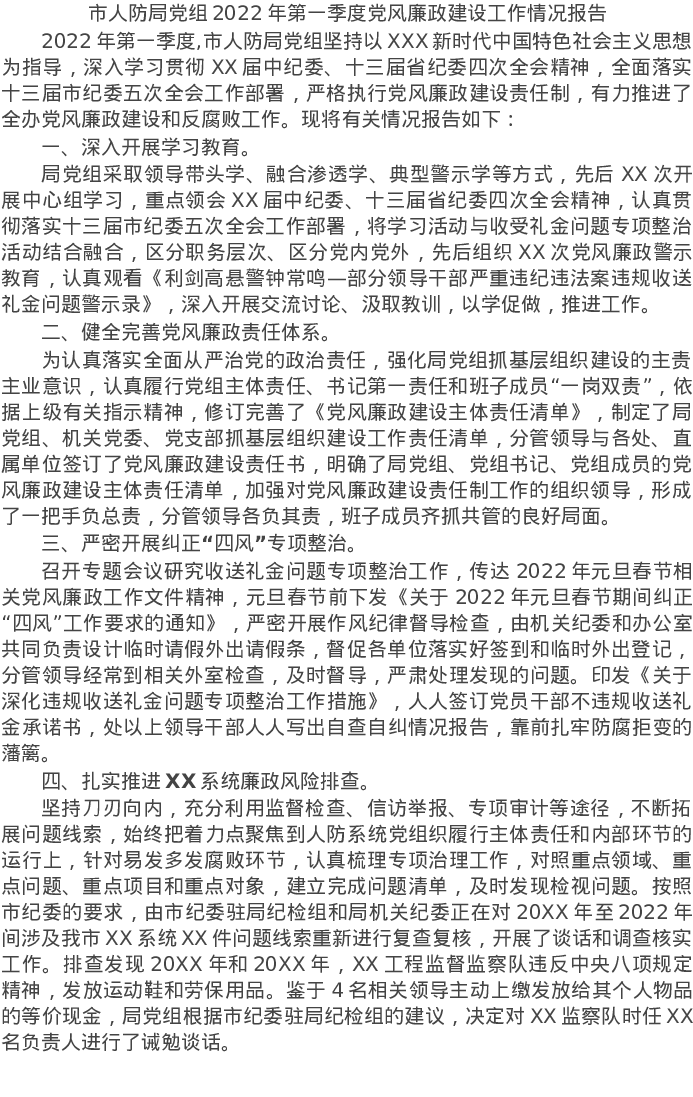 20220323市人防局党组2022年第一季度党风廉政建设工作情况报告