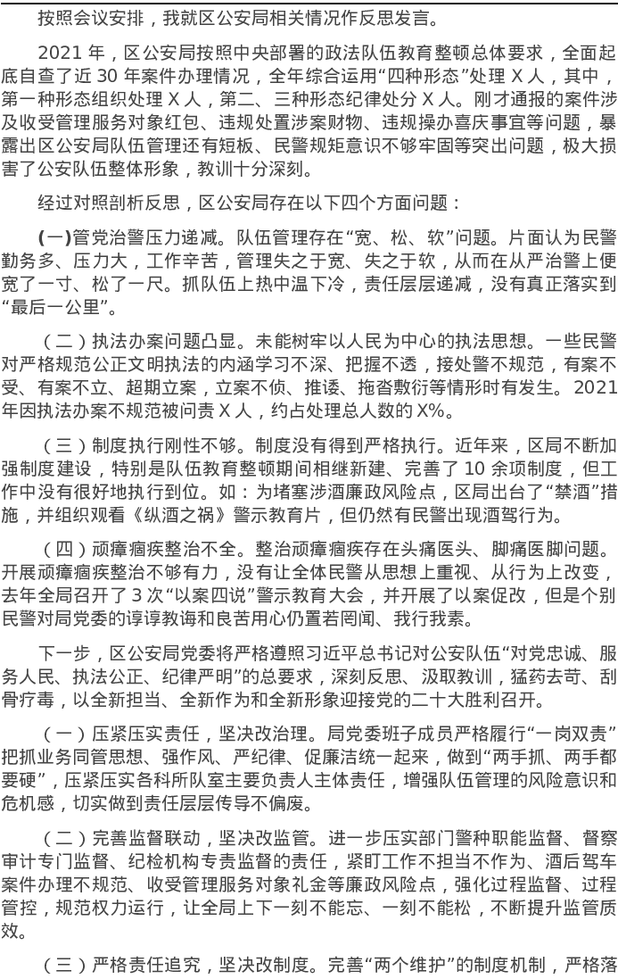 20220328区公安局在以案四说暨以案四改会议上的反思发言材料