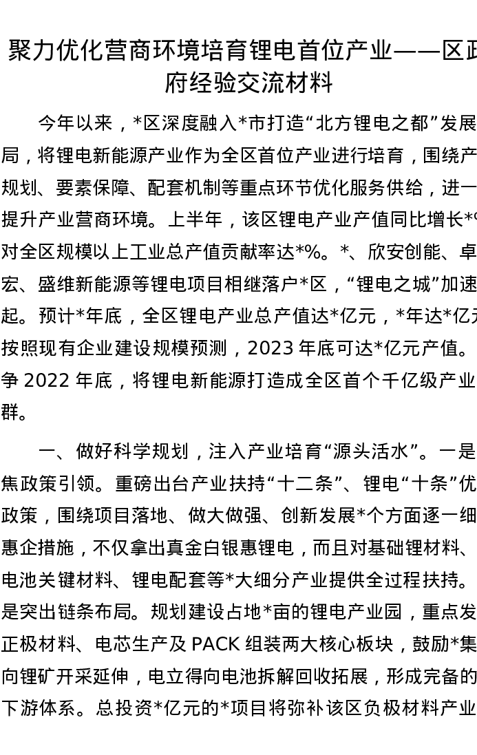 聚力优化营商环境 培育锂电首位产业——区政府经验交流材料