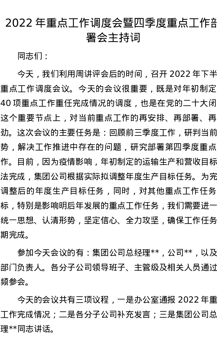 2022年重点工作调度会暨四季度重点工作部署会主持词