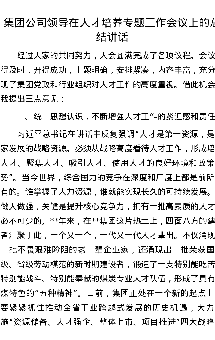 集团公司领导在人才培养专题工作会议上的总结讲话