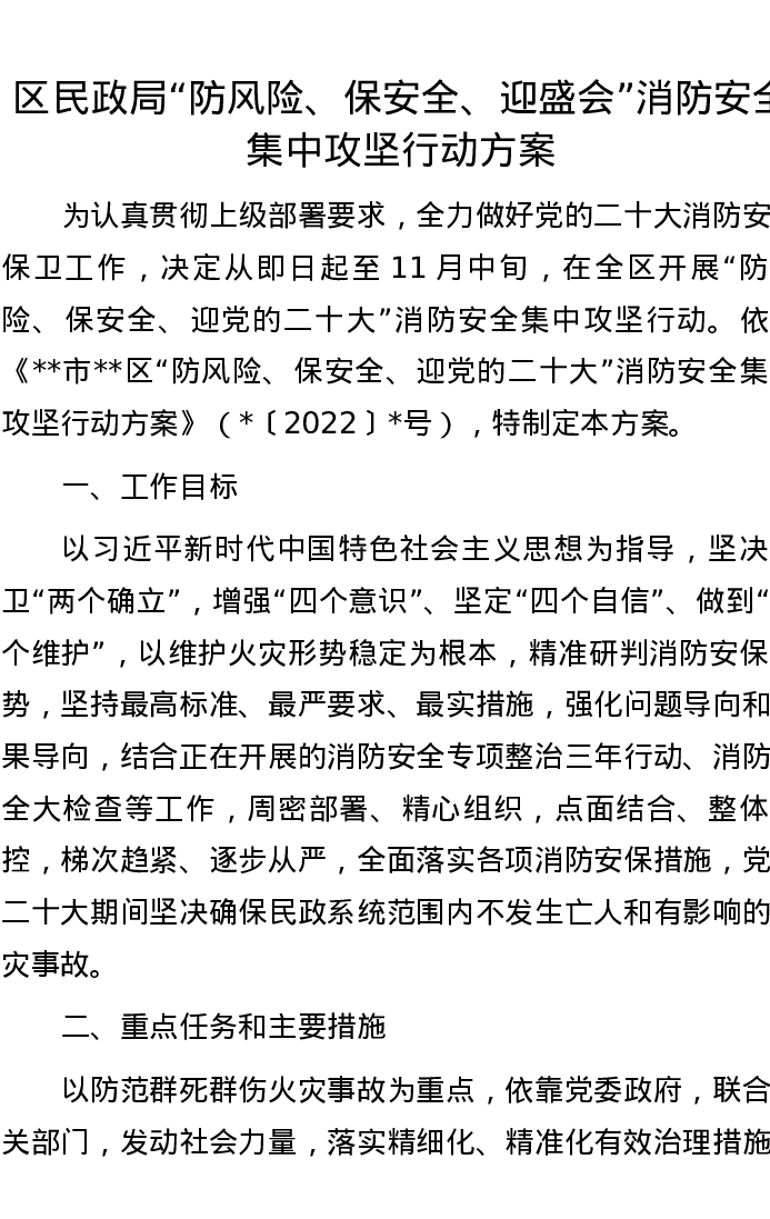 区民政局“防风险、保安全、迎盛会”消防安全集中攻坚行动方案