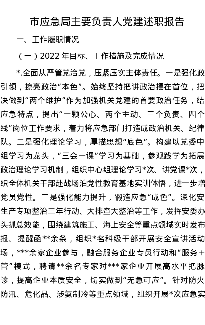 市应急局主要负责人党建述职报告