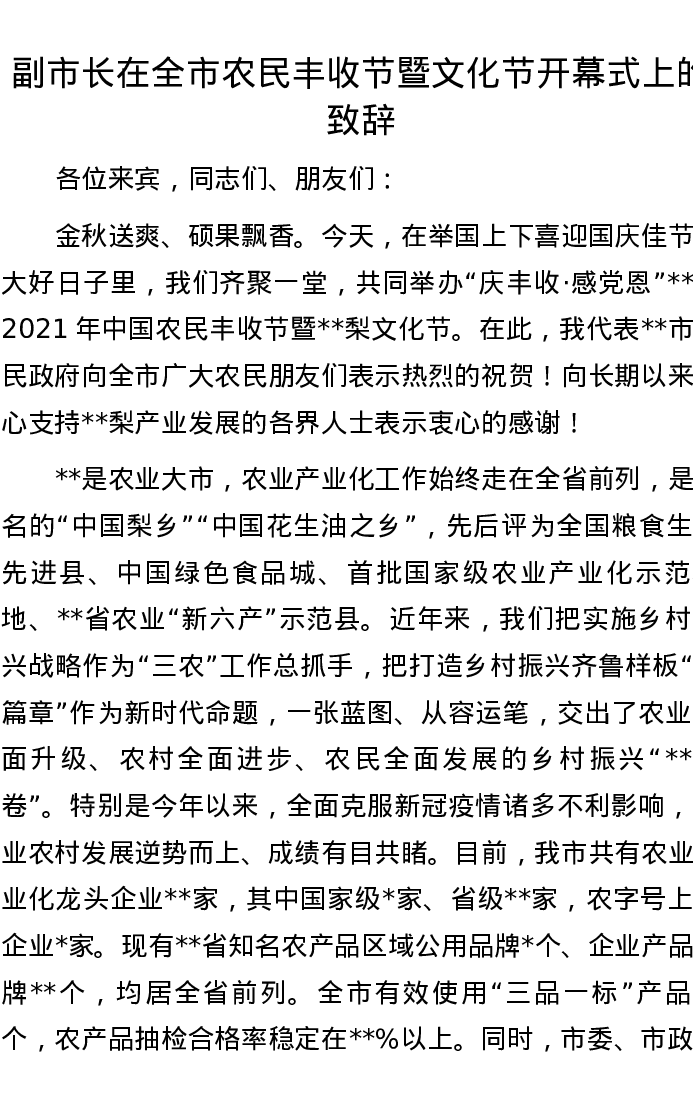 副市长在全市农民丰收节暨文化节开幕式上的致辞
