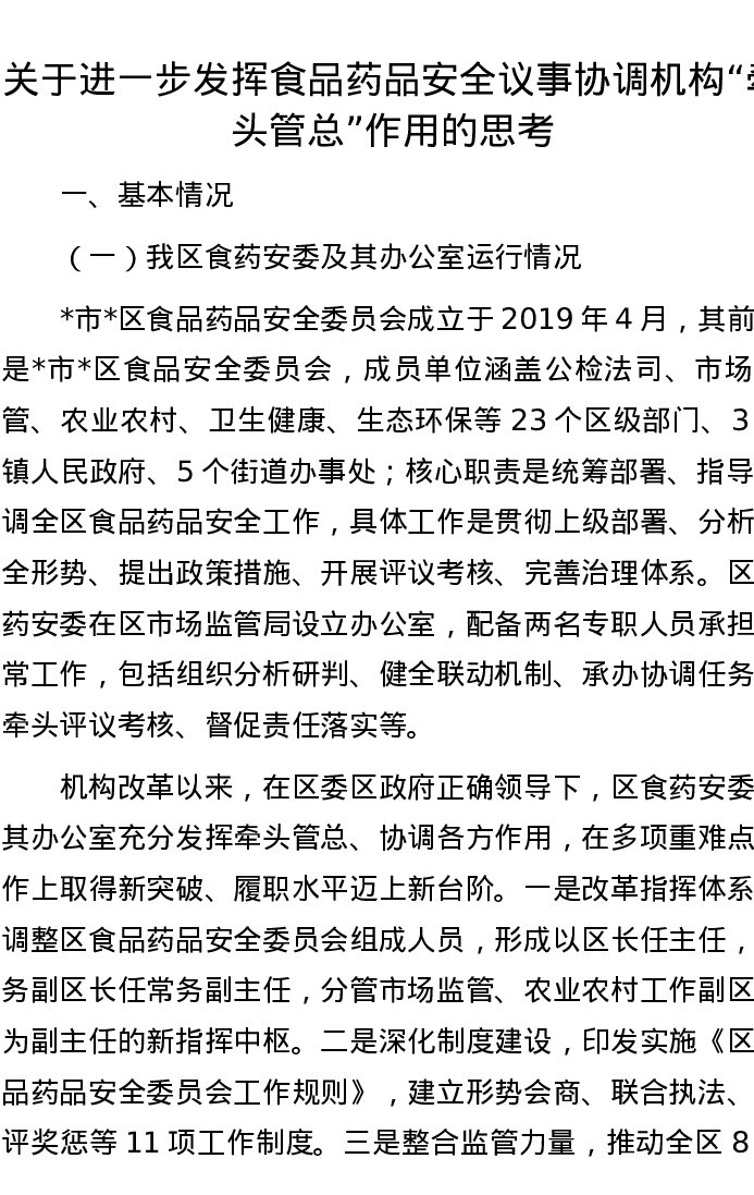 关于进一步发挥食品药品安全议事协调机构“牵头管总”作用的思考