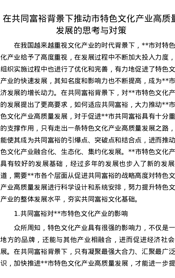 在共同富裕背景下推动市特色文化产业高质量发展的思考与对策