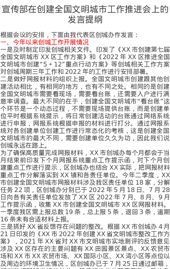 宣传部在创建全国文明城市工作推进会上的发言提纲