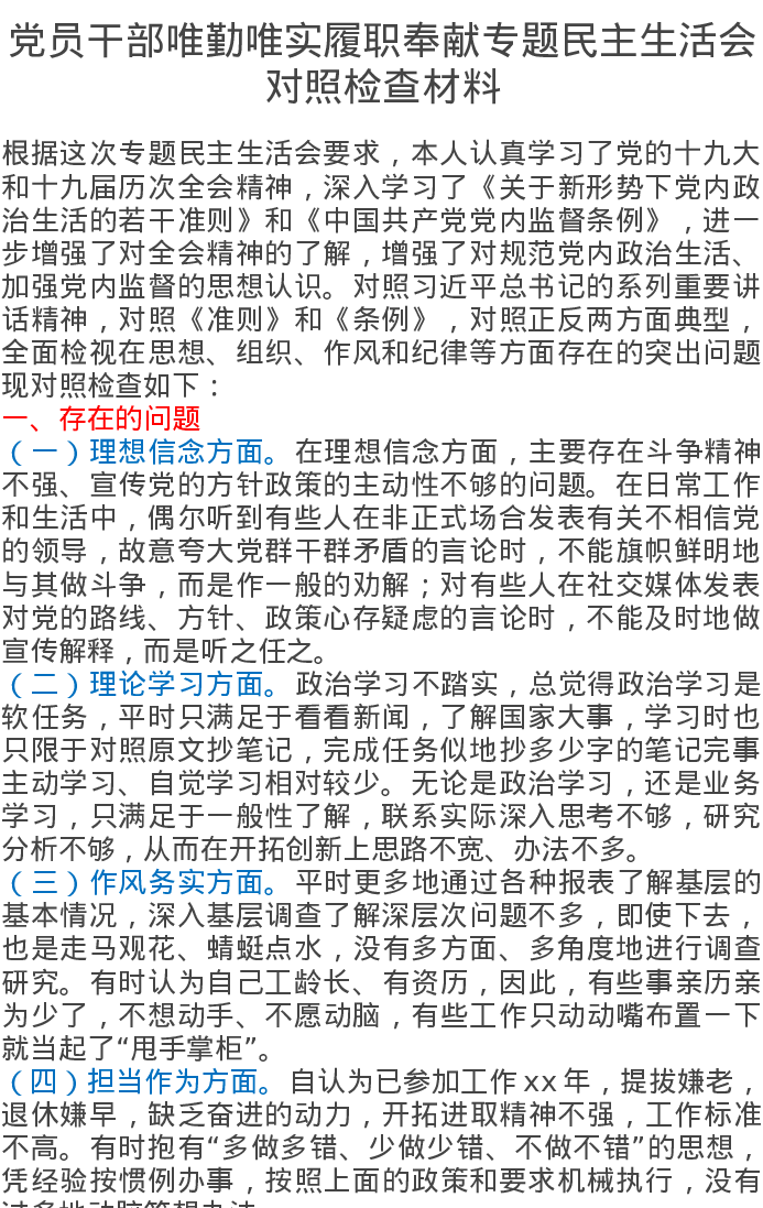 党员干部唯勤唯实履职奉献专题民主生活会对照检查材料