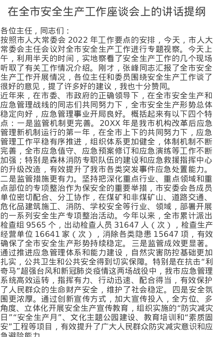 在全市安全生产工作座谈会上的讲话提纲