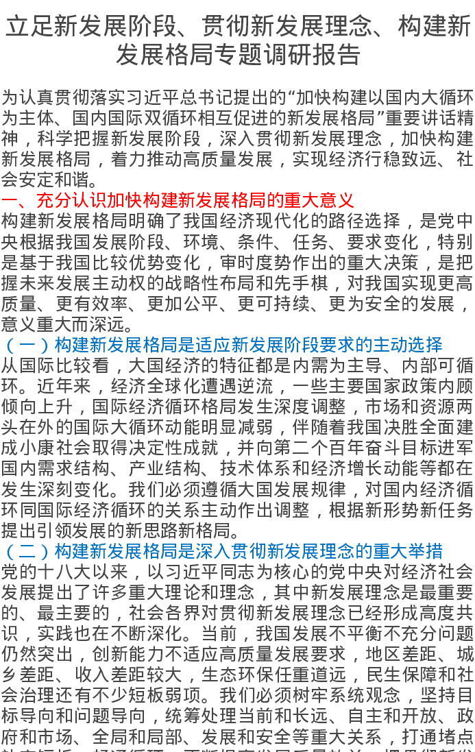 立足新发展阶段、贯彻新发展理念、构建新发展格局专题调研报告