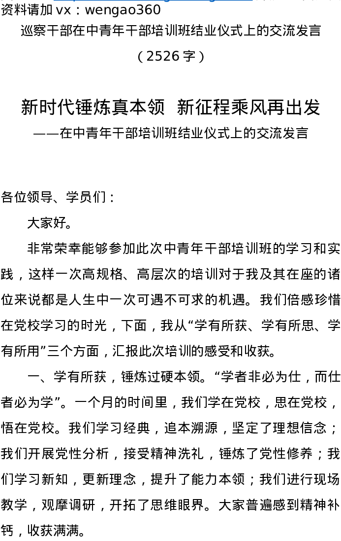 巡察干部在中青年干部培训班结业仪式上的交流发言(1)