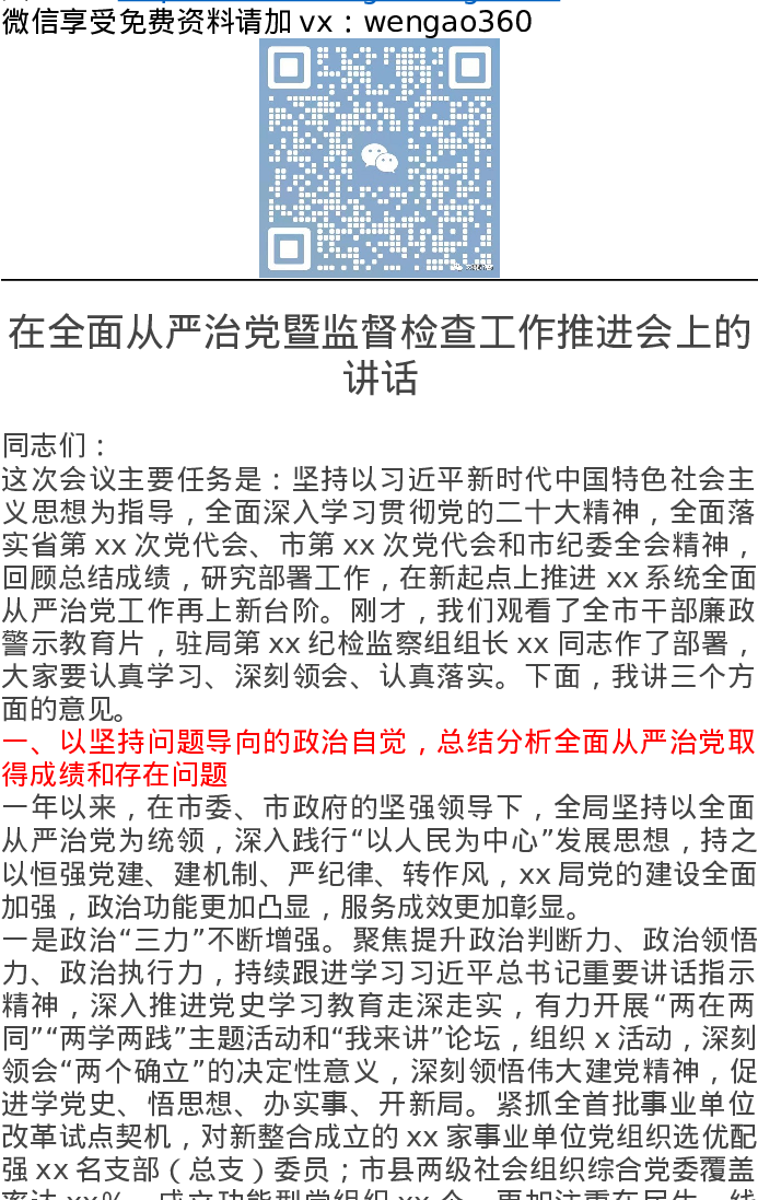 在全面从严治党暨监督检查工作推进会上的讲话