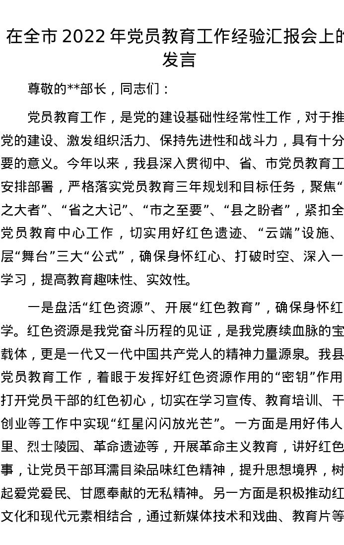 20221101在全市2022年党员教育工作经验汇报会上的发言
