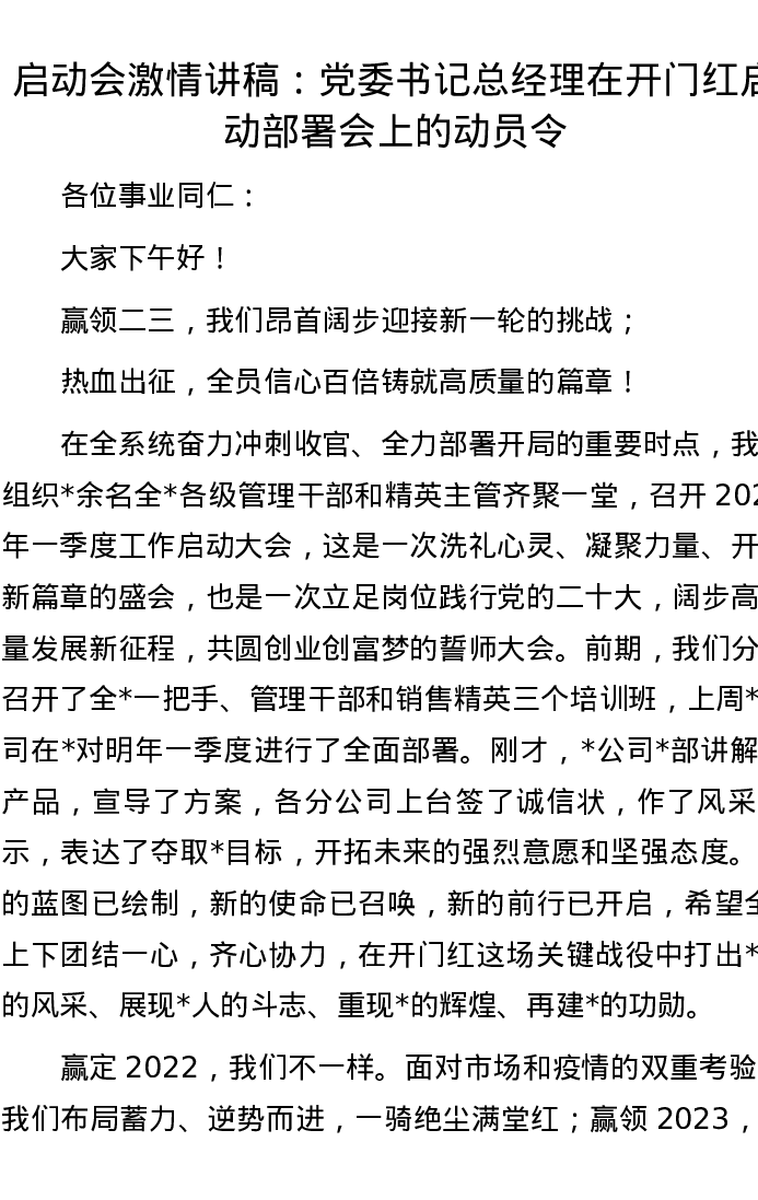 20221104启动会激情讲稿:党委书记总经理在开门红启动部署会上的动员令