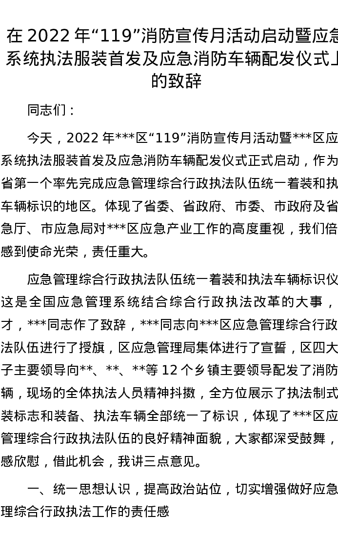 20221102在2022年“119”消防宣传月活动启动暨应急系统执法服装首发及应急消防车辆配发仪式上的致辞