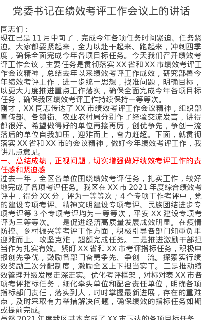 党委书记在绩效考评工作会议上的讲话