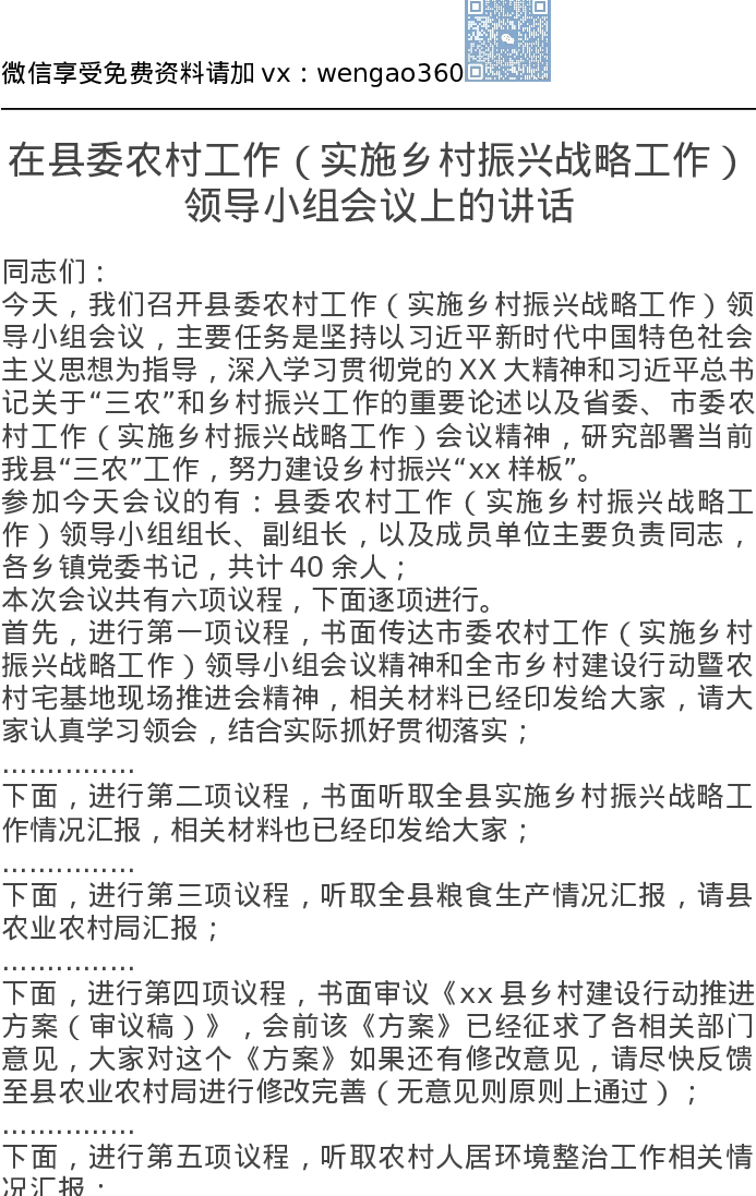 在县委农村工作(实施乡村振兴战略工作)领导小组会议上的讲话
