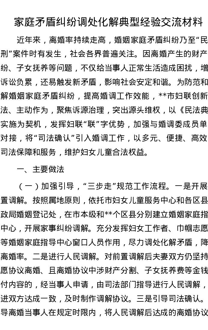 20221116家庭矛盾纠纷调处化解典型经验交流材料