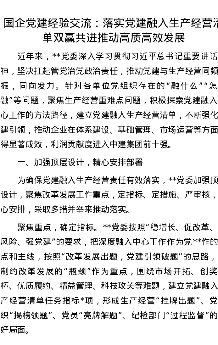 20221116国企党建经验交流:落实党建融入生产经营清单 双赢共进推动高质高效发展