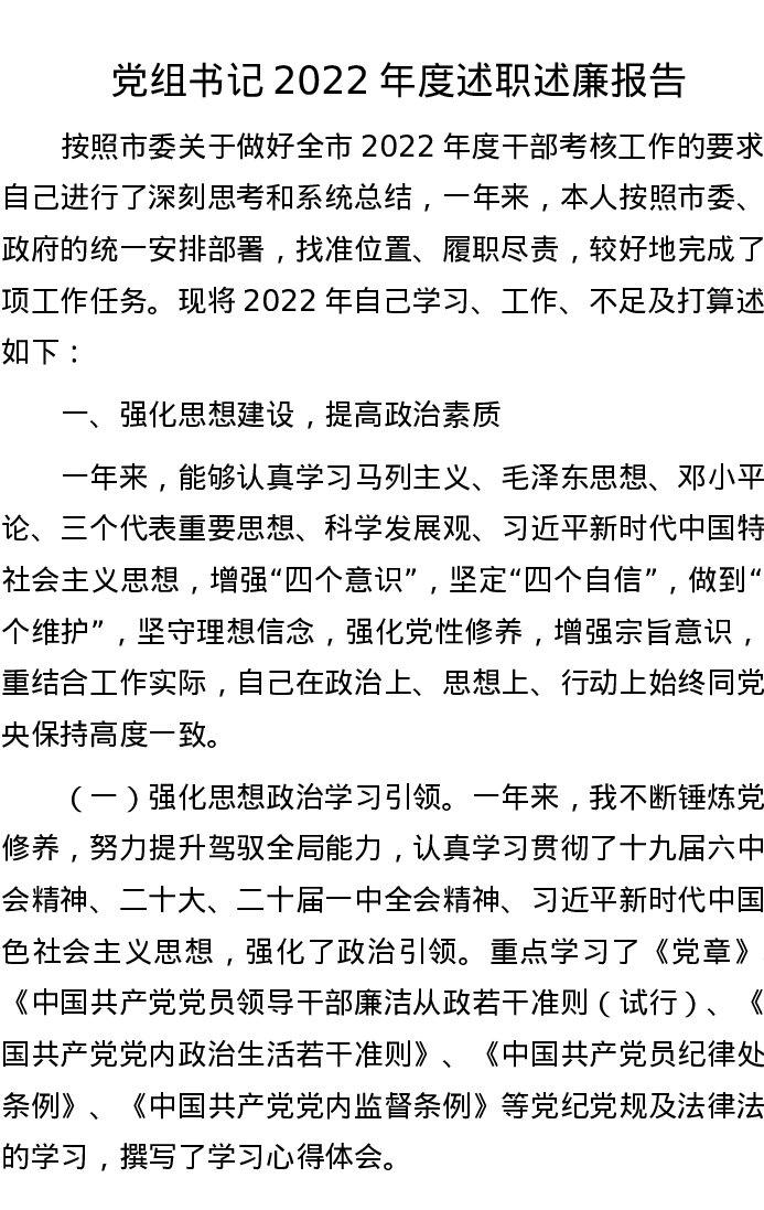 20221114党组书记2022年度述职述廉报告