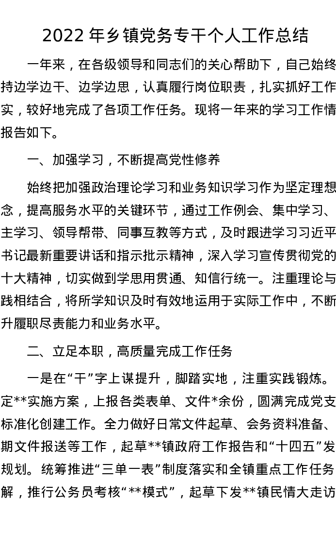 202211162022年乡镇党务专干个人工作总结