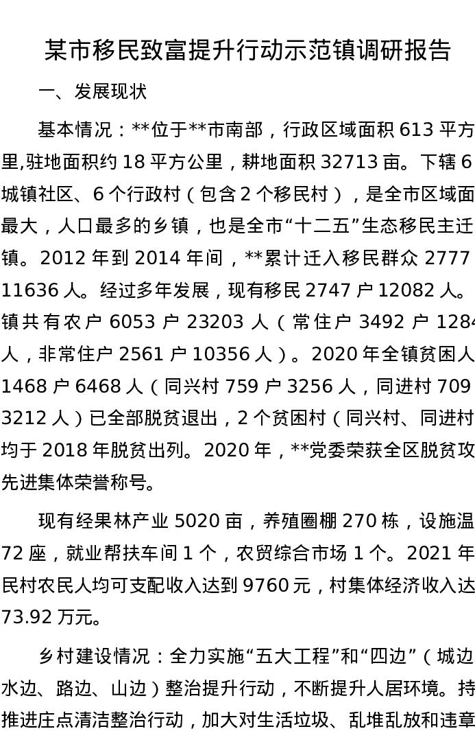 20221116某市移民致富提升行动示范镇调研报告