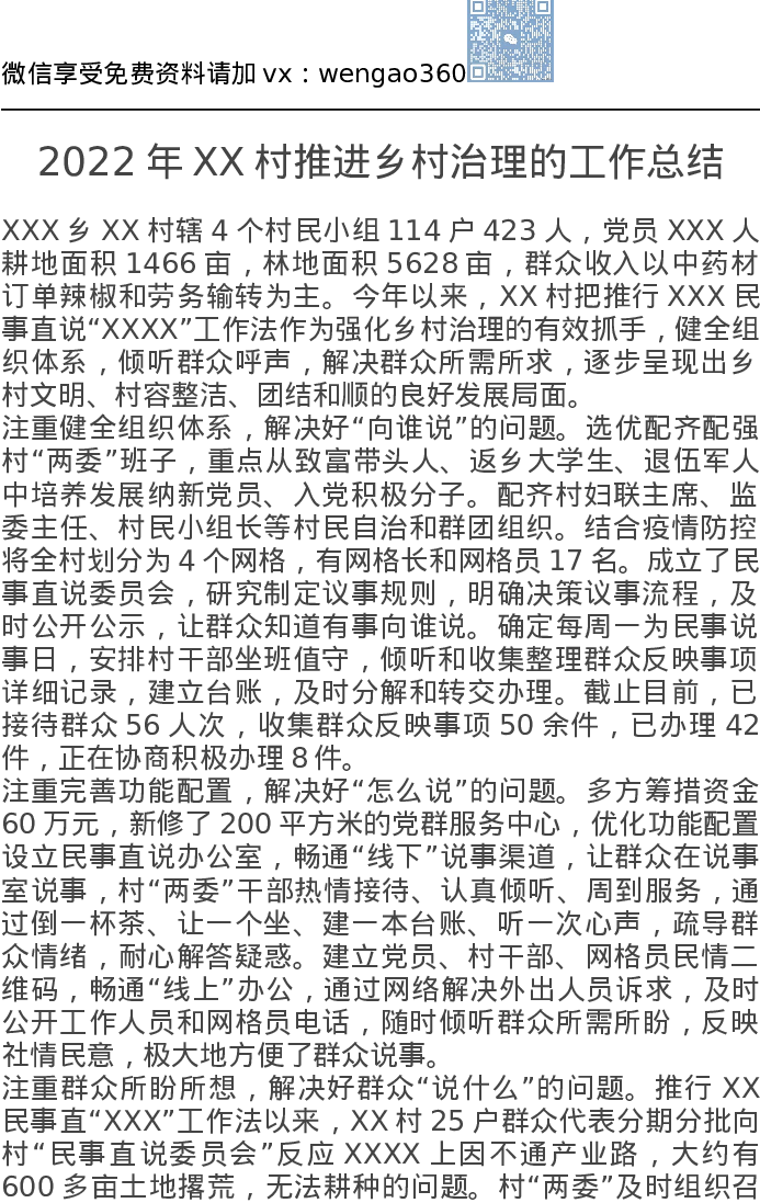 2022年XX村推进乡村治理的工作总结