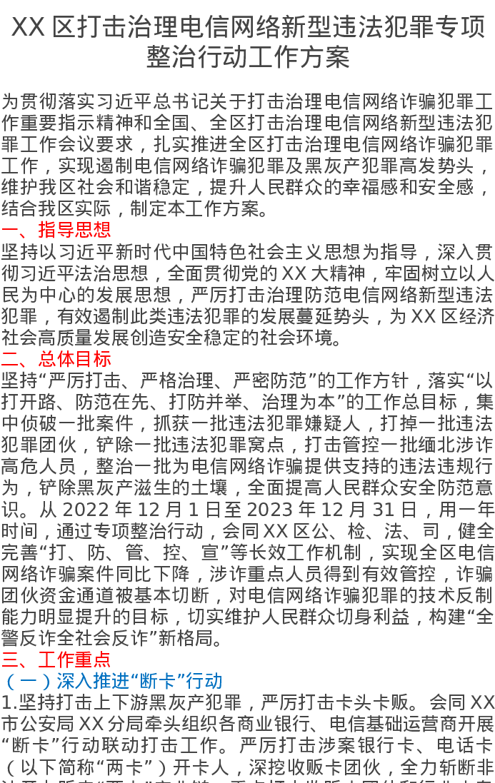 XX区打击治理电信网络新型违法犯罪专项整治行动工作方案