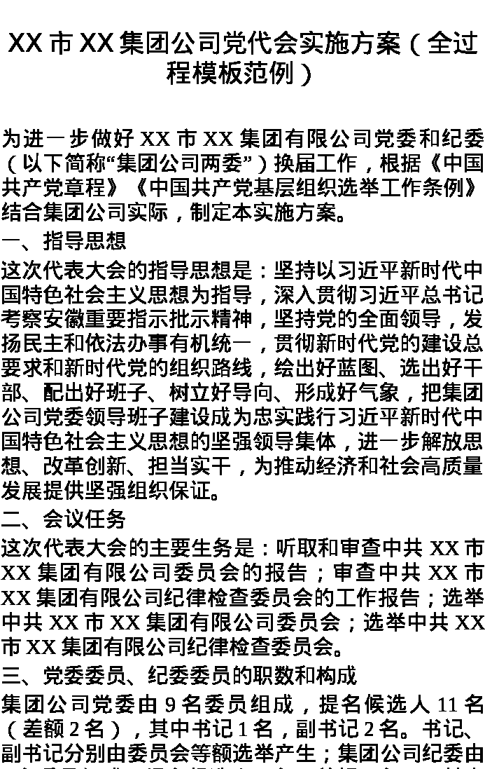 XX市XX集团公司党代会实施方案(全过程模板范例)