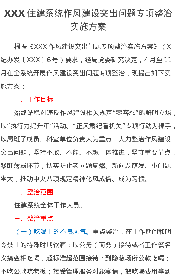 XXX住建系统作风建设突出问题专项整治实施方案