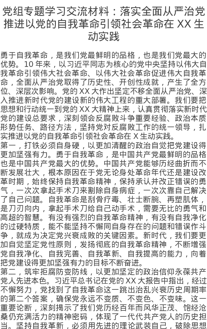 党组专题学习交流材料:落实全面从严治党,推进以党的自我革命引领社会革命在XX生动实践