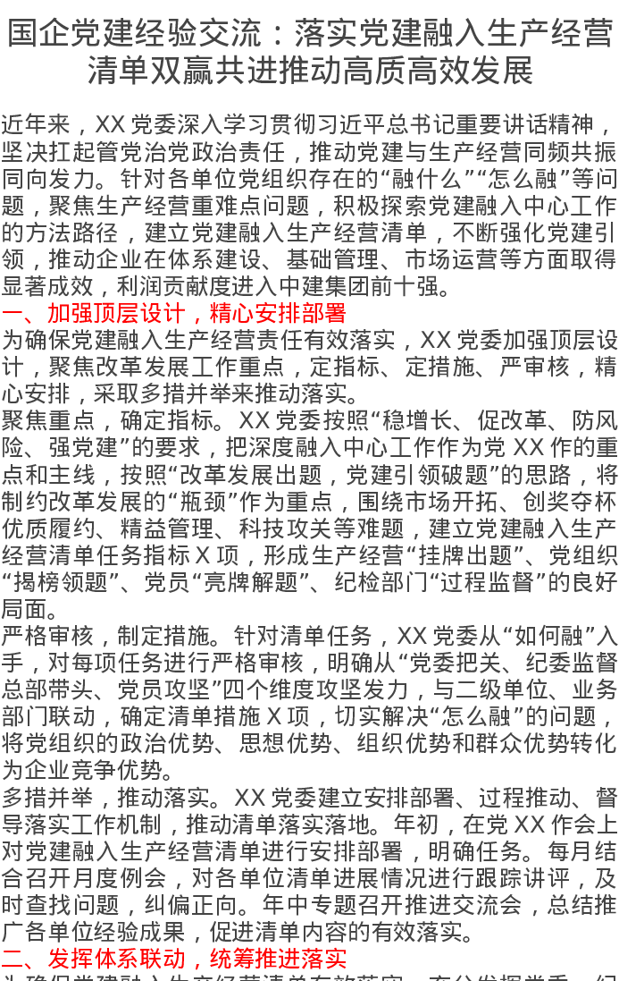 国企党建经验交流:落实党建融入生产经营清单双赢共进推动高质高效发展