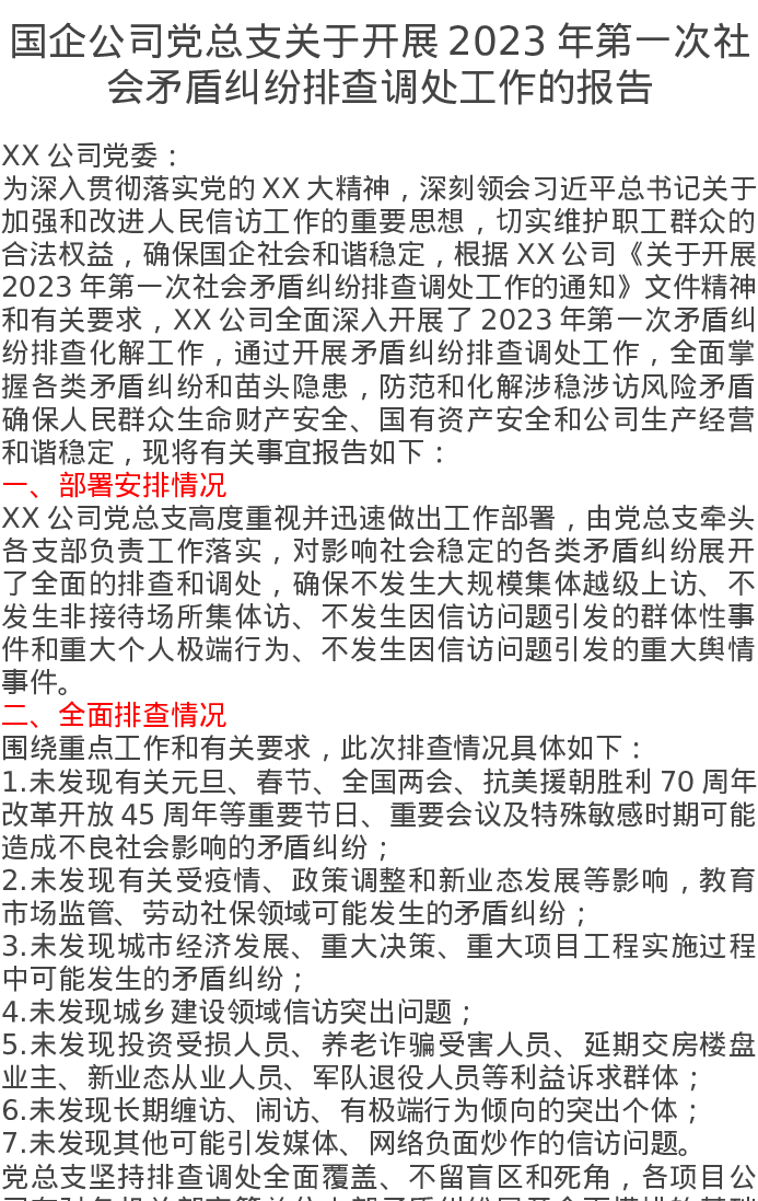 国企公司党总支关于开展2023年第一次社会矛盾纠纷排查调处工作的报告