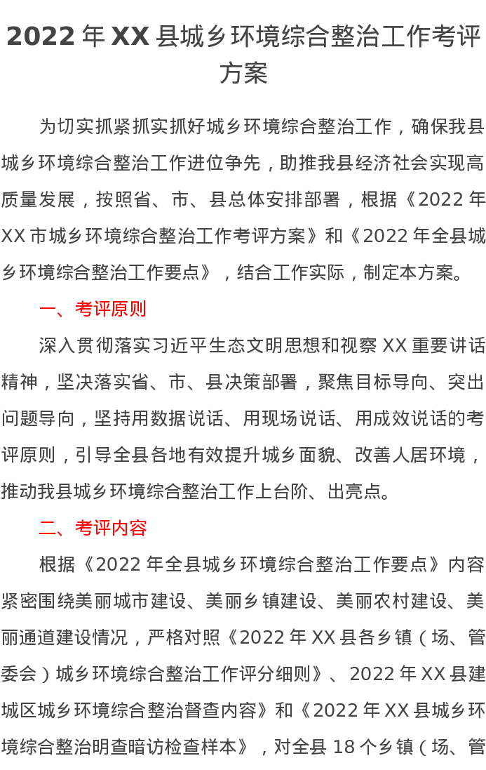 2022年XX县城乡环境综合整治工作考评方案