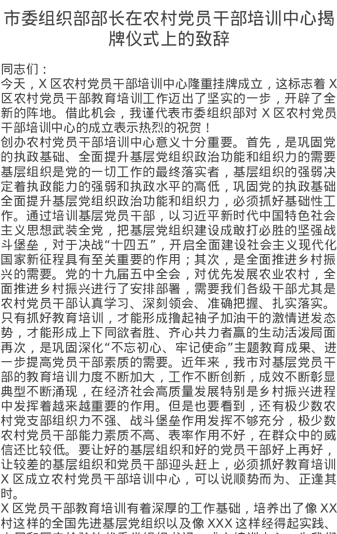 市委组织部部长在农村党员干部培训中心揭牌仪式上的致辞