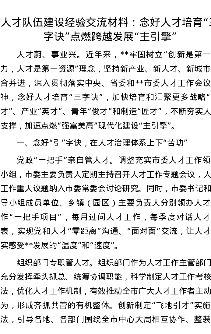 人才队伍建设经验交流材料:念好人才培育“三字诀” 点燃跨越发展“主引擎”