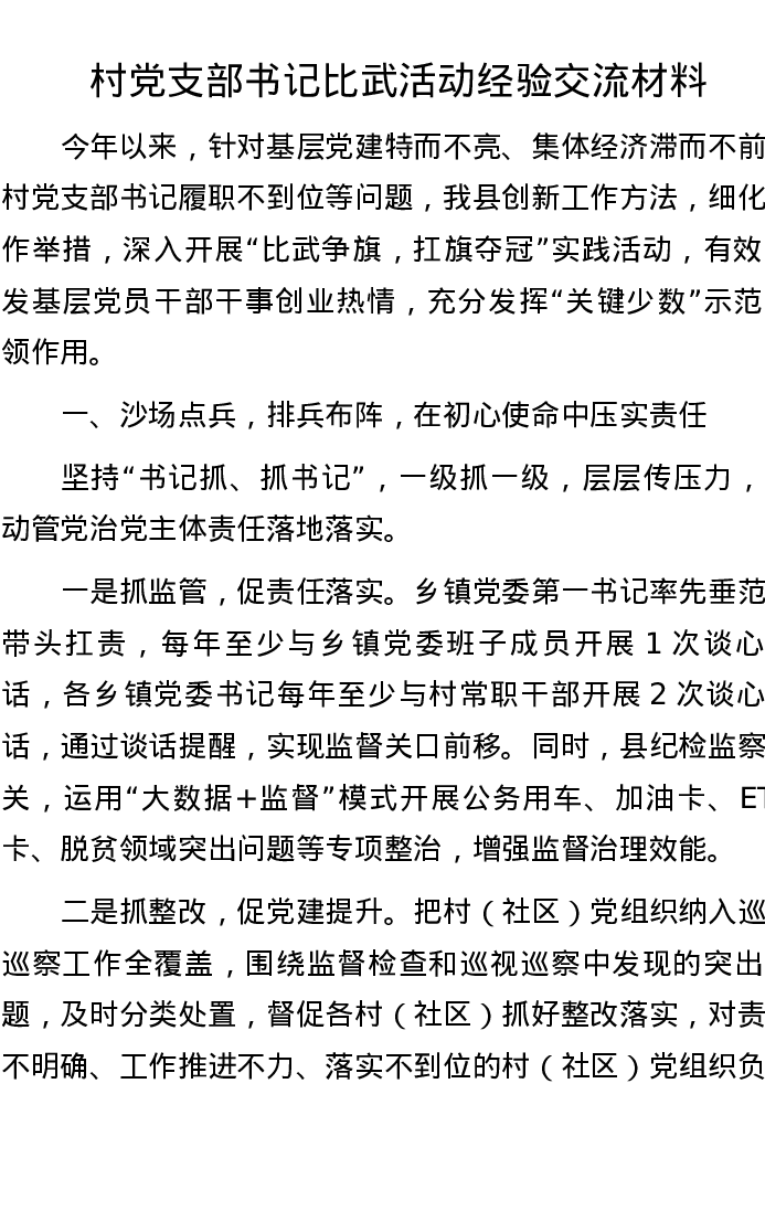 村党支部书记比武活动经验交流材料