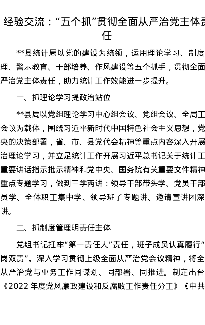 经验交流:“五个抓”贯彻全面从严治党主体责任