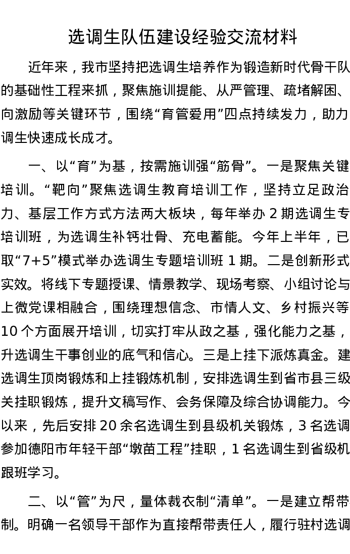 选调生队伍建设经验交流材料