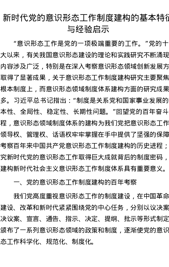 新时代党的意识形态工作制度建构的基本特征与经验启示