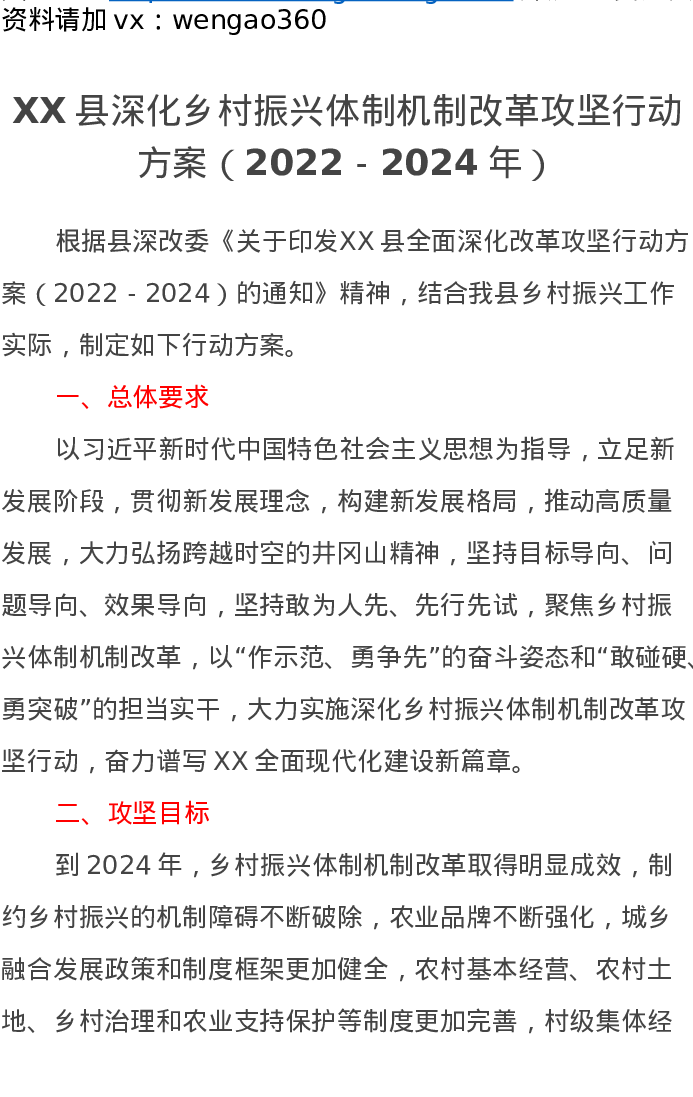 XX县深化乡村振兴体制机制改革攻坚行动方案(2022-2024年)
