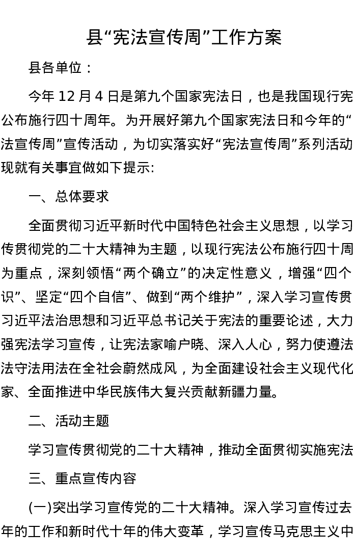 县“宪法宣传周” 工作方案