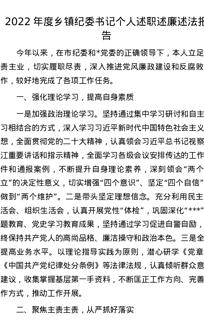 2022年度乡镇纪委书记个人述职述廉述法报告