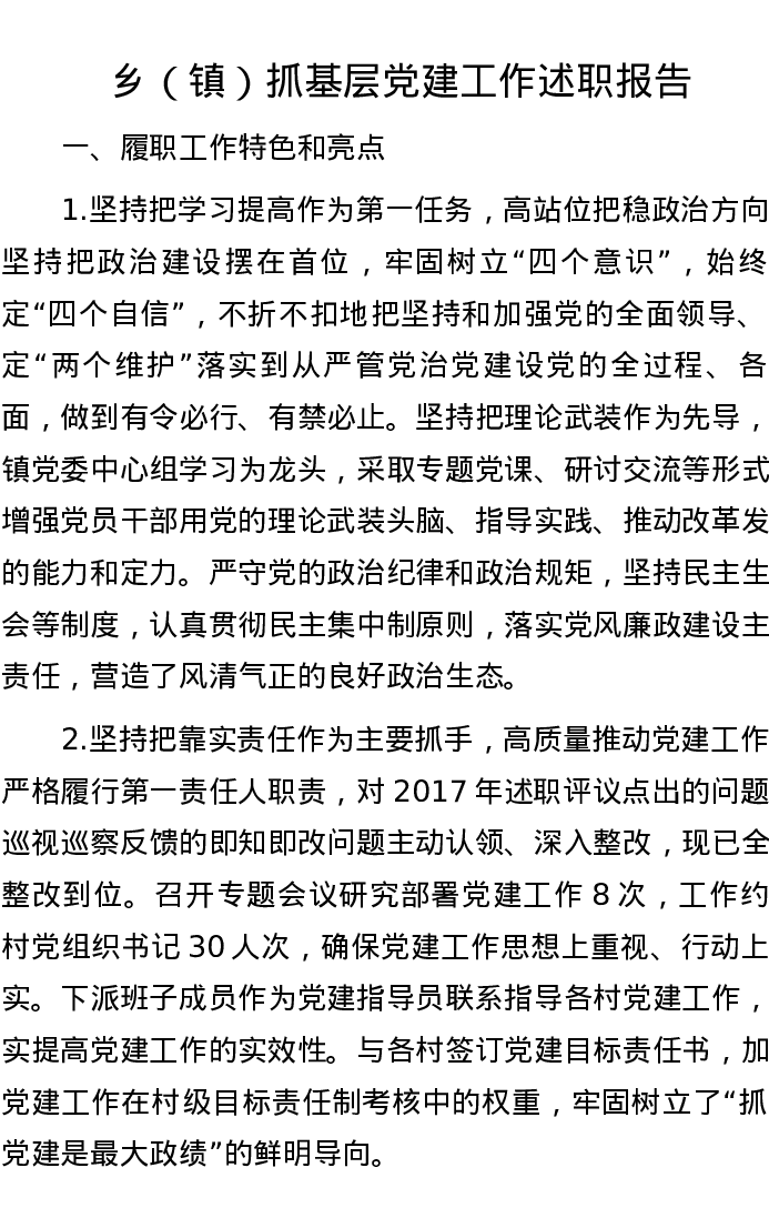 乡(镇)抓基层党建工作述职报告