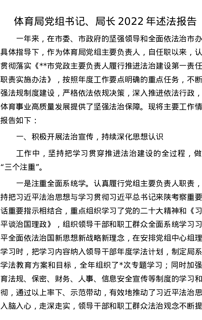 体育局党组书记、局长2022年述法报告