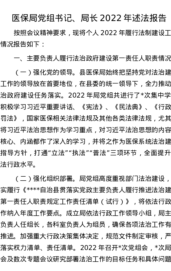 医保局党组书记、局长2022年述法报告